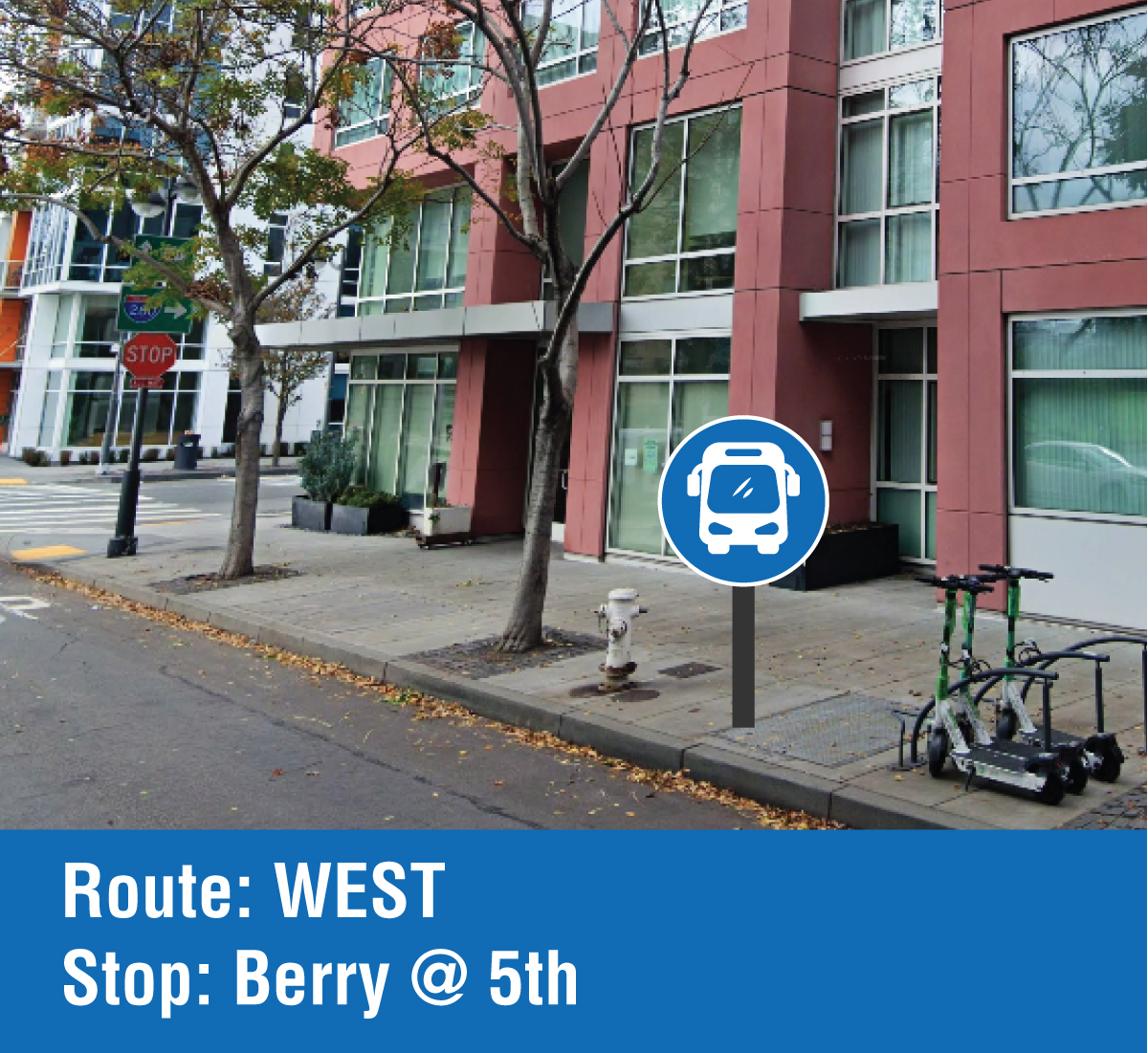 7th St. just before Market in the white passenger loading zone in front of Yotel. Riders are welcome to wait under the overhang or in the hotel lobby. A pop-up coffee cart operates in the lobby from 6:30-9:00am. Note: This stop is for East & West route buses; CCA-Adobe route stops at 8th & Market.